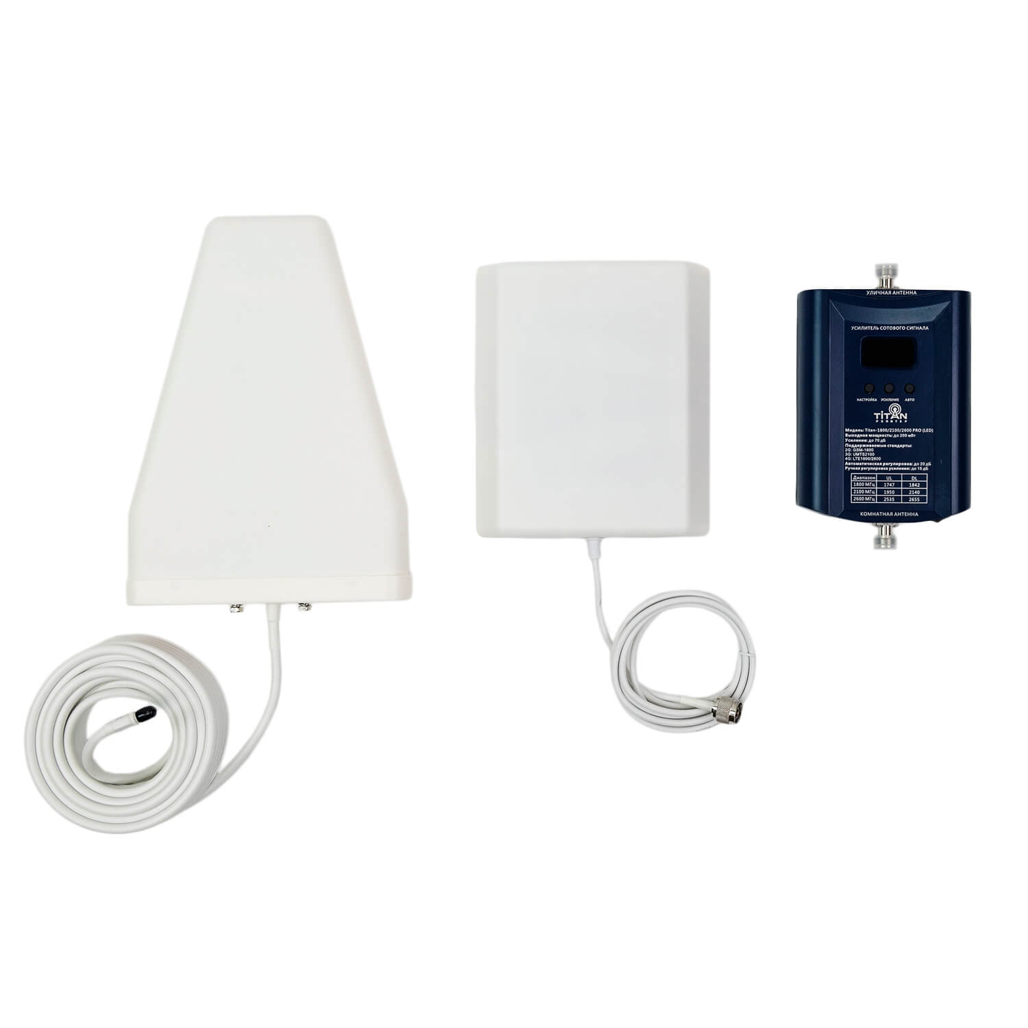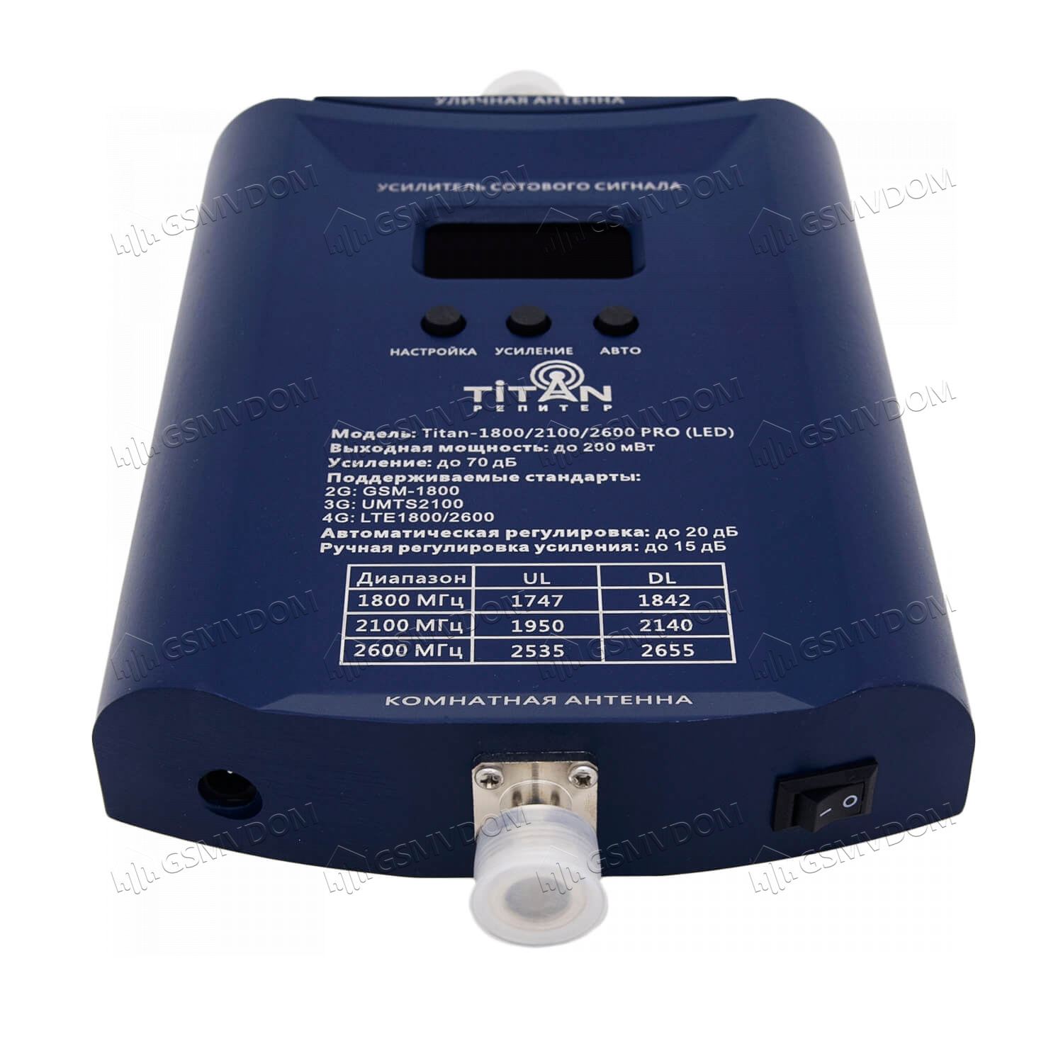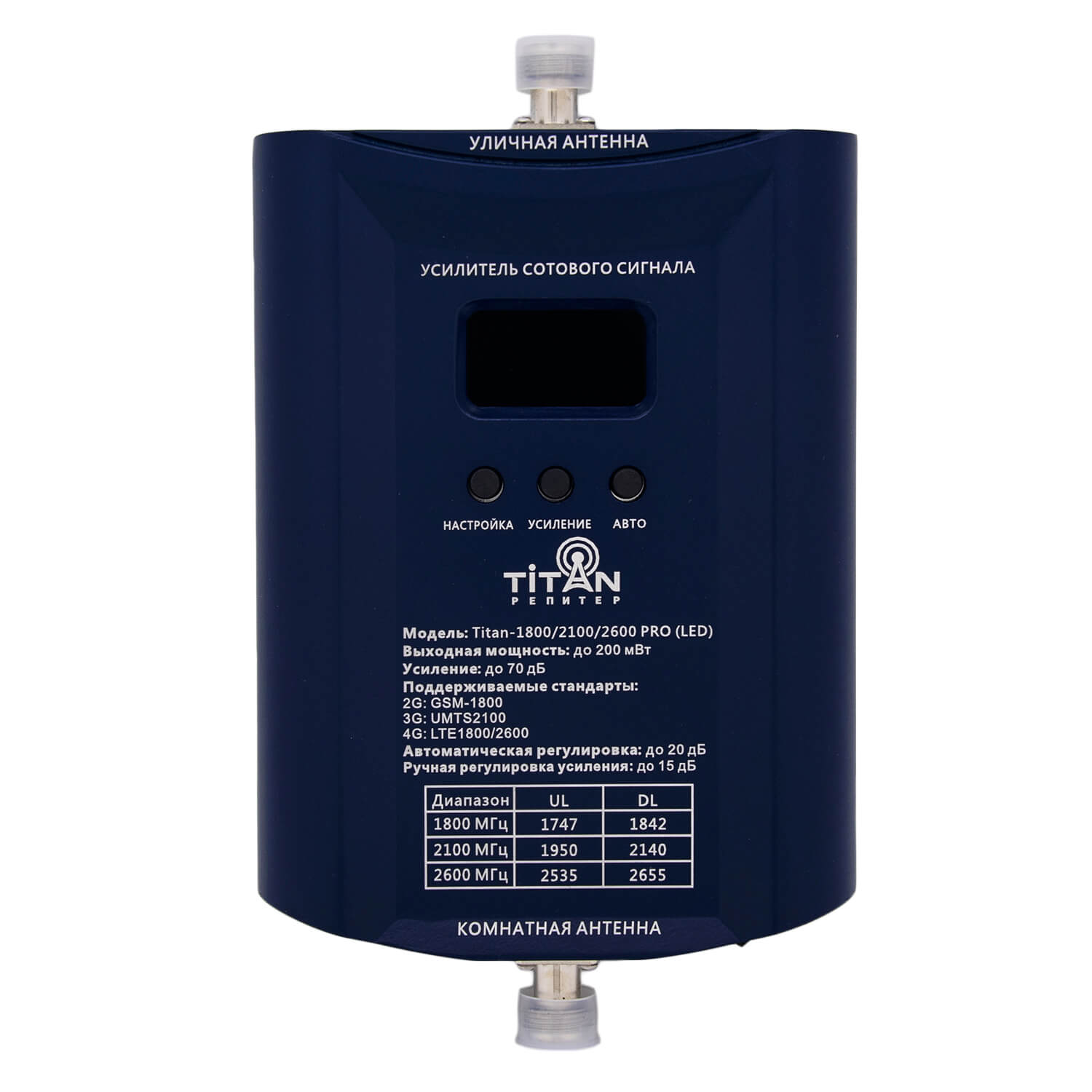 Усилитель сигнала связи Titan-1800/2100/2600 PRO комплект (LED) включает в себя репитер, внешнюю и внутреннюю антенны, кабельный провод с понижающим адаптером, а также крепёжные элементы. Может устанавливаться в жилых и производственных помещениях, эффективен на площади до 1000 кв.м. Максимальное усиление составляет 83 дБ, предусмотрена защита от перегрузки и режима самовозбуждения. Охлаждение естественное, поэтому при монтаже важно учитывать расположение вентиляционных отверстий.